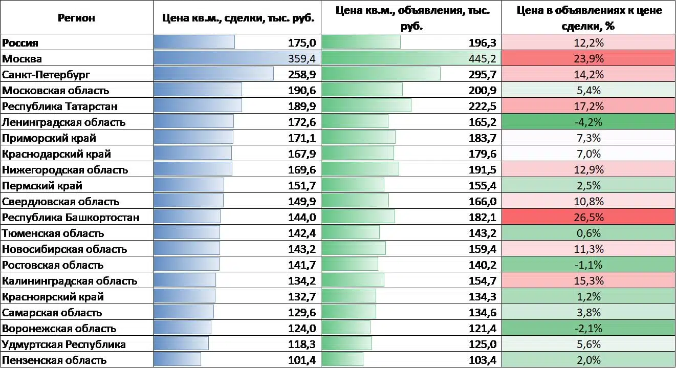По данным Домклика и Сбера, разница между стоимостью квадрата в объявлениях и в сделках составляет в среднем 12,2%. Где-то больше, а где-то меньше. Но в Ленинградской, Воронежской и Ростовской областях цены сделок превысили цены в объявлениях.